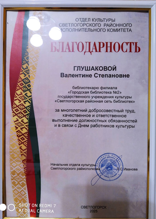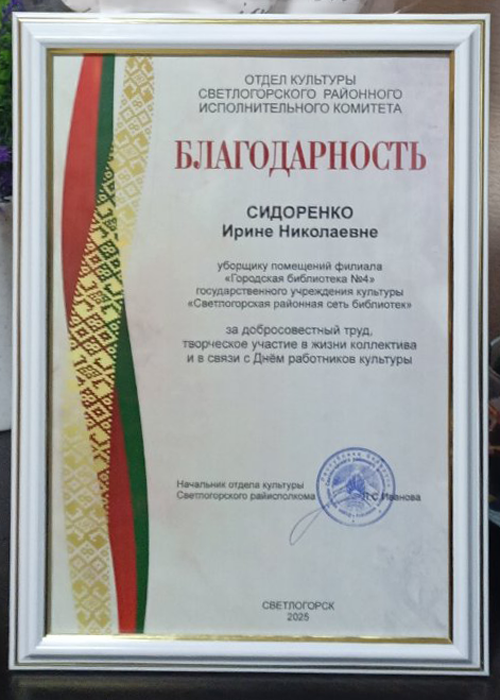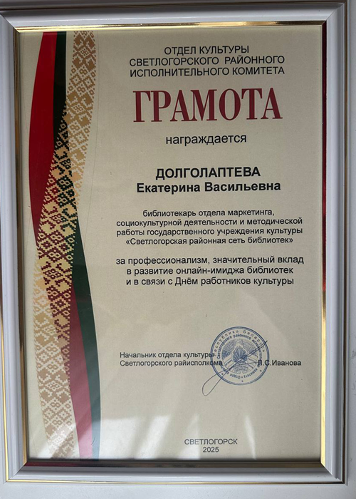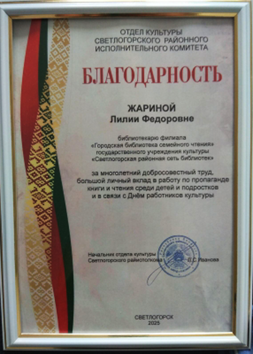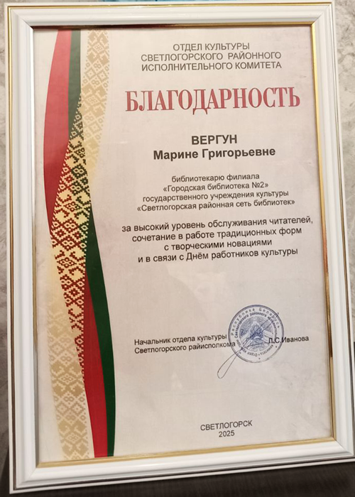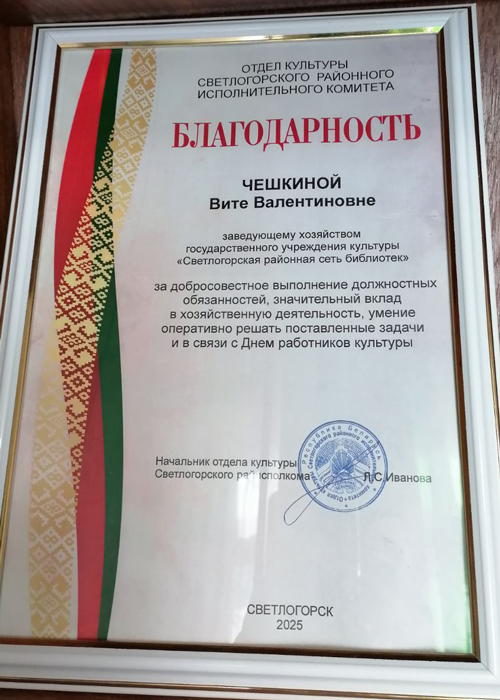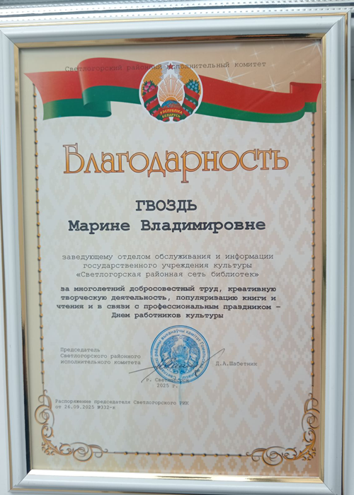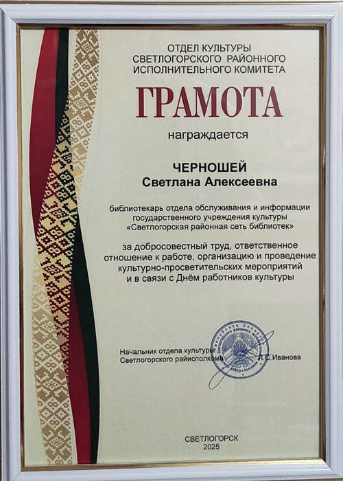 11 марта 2025 г. в Гомельской областной универсальной библиотеке им. В.И. Ленина прошел областной семинар. Директору Светлогорской районной сети библиотек Бусел В.С. вручена Почётная грамота за плодотворную социокультурную деятельность и формирование положительного имиджа библиотек.