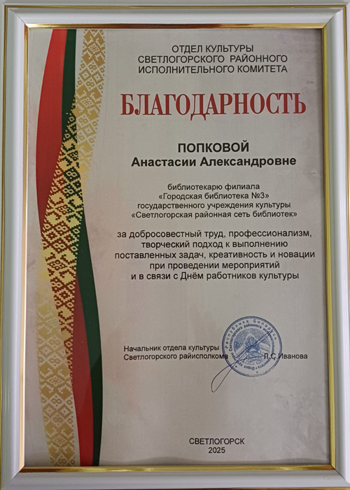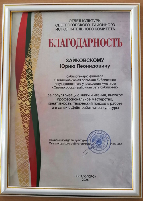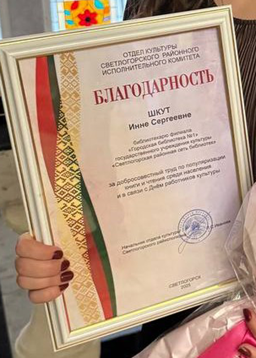 Председатель Гомельского облисполкома Иван Иванович Крупко наградил предприятия и организации за лучшую организацию идеологической работы. Среди победителей государственное учреждение культуры «Светлогорская районная сеть библиотек», занявшая 2 место среди организаций, осуществляющих деятельность в области культуры, по организации отдыха и развлечений за 2024 год.