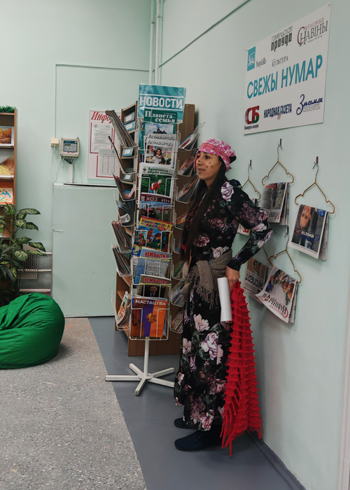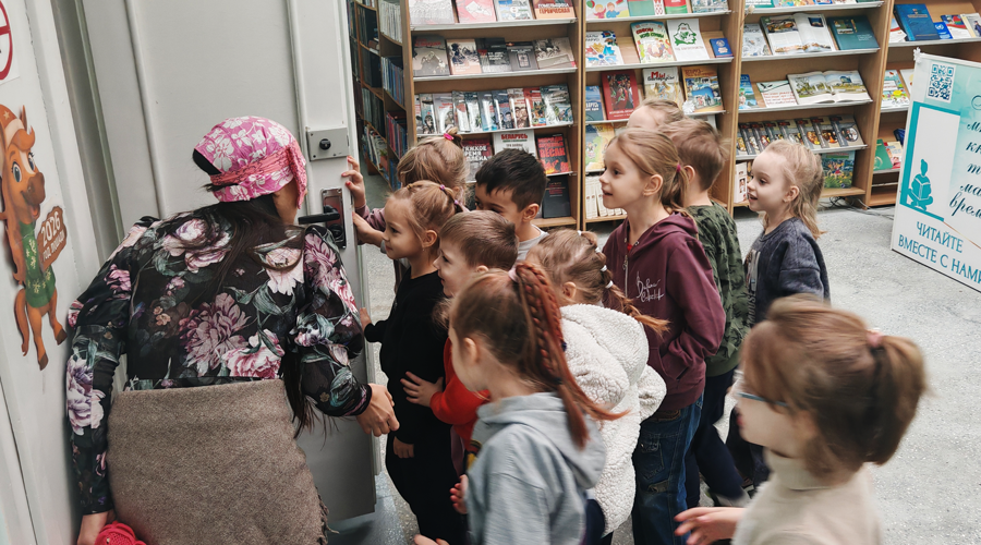 Во время экскурсии встретились с Бабой Ягой, которая пришла, чтобы записаться в библиотеку и взять книги, но не знала правил. Ребята с интересом наблюдали за проделками Бабы Яги.