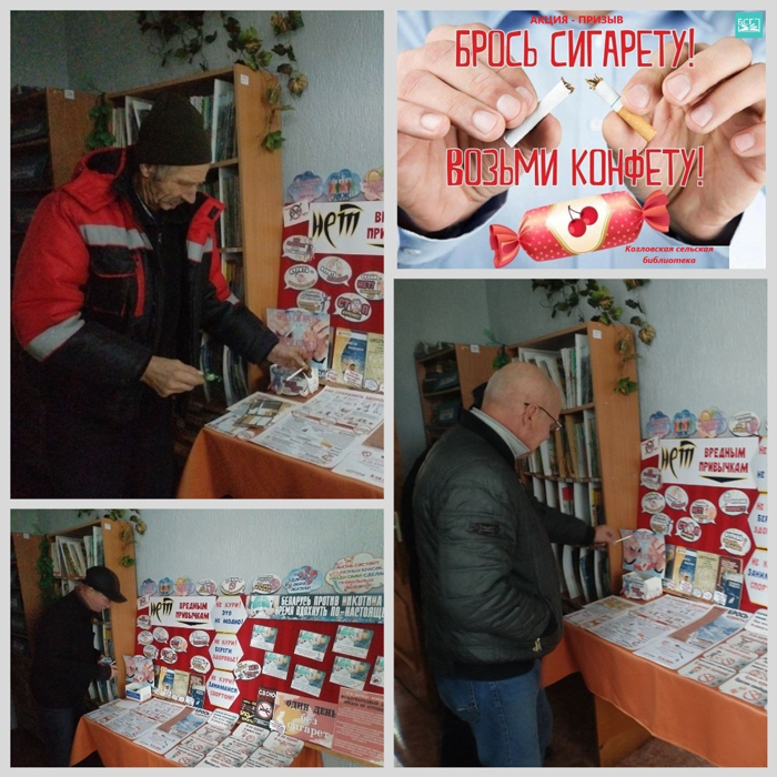 В рамках агитационного марафона «Если не слабак-бросай курить табак» в Козловской сельской библиотеке оформлена выставка-призыв «НЕТ вредным привычкам!». Выставка направлена на привлечение внимания к проблемам табакокурения и популяризацию здорового образа жизни среди населения. Посещение выставки — это прекрасная возможность поддержать свое здоровье и внести вклад в формирование культуры здорового образа жизни среди окружающих. Кроме того, библиотекарь предлагает принять участие в акции «Брось сигарету — возьми конфету». Каждый участник сможет обменять свою последнюю сигарету на сладкое угощение, написать письмо курильщику и поддержать своё решение отказаться от пагубной привычки.