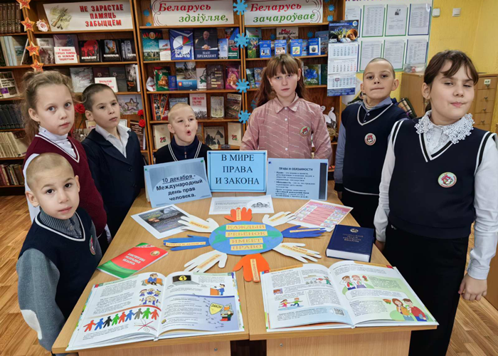 Библиотекарь рассказала посетителям об истории Дня прав человека. Было отмечено, что личные, политические, экономические, социальные и культурные права граждан Беларуси закреплены в Конституции Республики Беларусь– основном законе нашей страны. Права и обязанности детей освещены в Конвенции о правах ребёнка и Законе «О правах ребёнка».