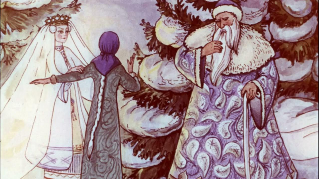 Леший сидит на сухом пне. Все небо покрывается прилетевшими из-за моря птицами. Весна-Красна на журавлях, лебедях и гусях спускается на землю, окруженная свитой птиц.