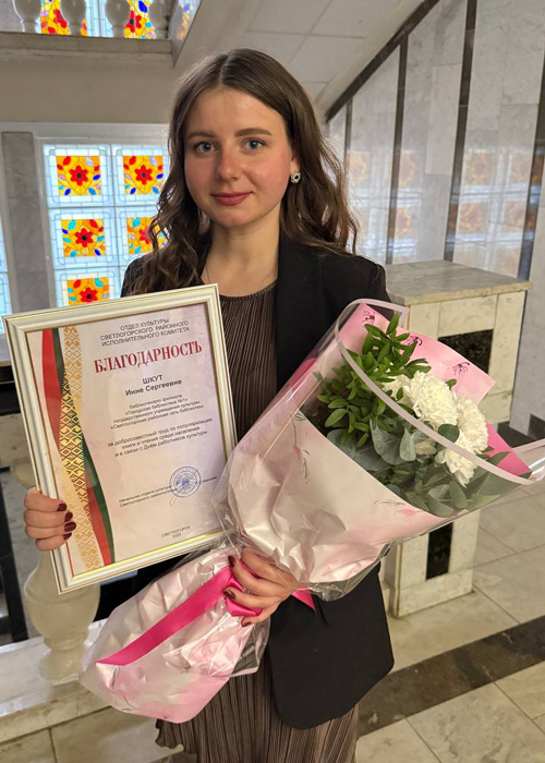 Благодарностью Светлогорского районного исполнительного комитета за многолетний добросовестный труд, креативную творческую деятельность и популяризацию книги и чтения была отмечена Гвоздь Марина, заведующий отделом обслуживания и информации.