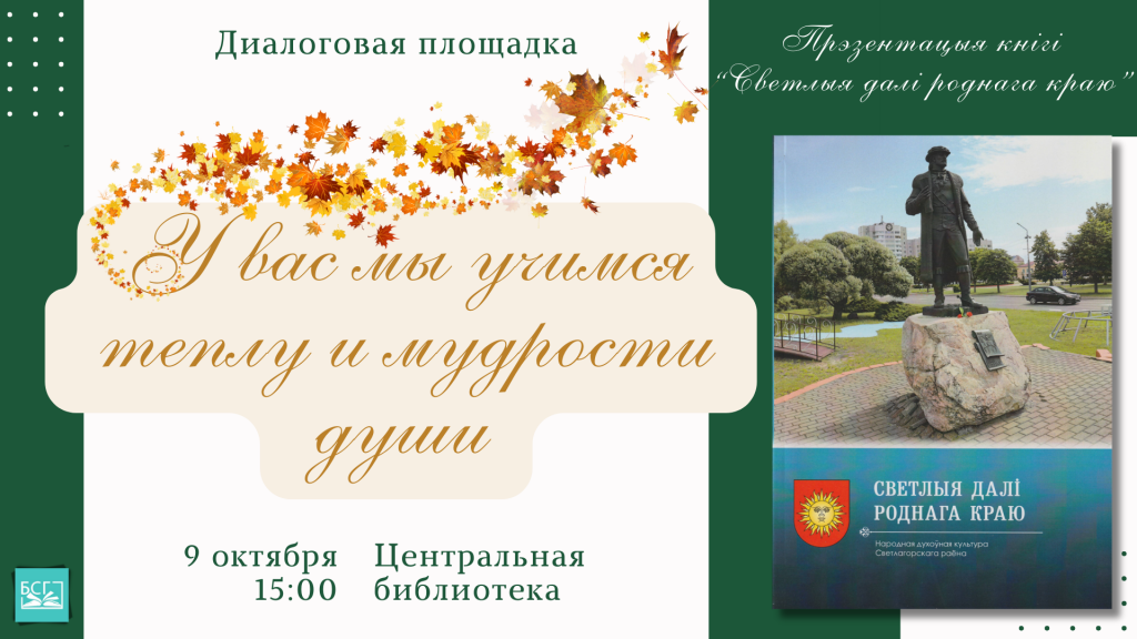 Мы будем рады видеть вас на диалоговой площадке «У Вас мы учимся теплу и мудрости души». В программе – презентация книг о Светлогорском районе, где отражена народная, духовная культура родного края.